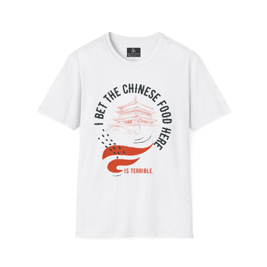 Unisex "I Bet The Chinese Food Here Is Terrible" Cotton Graphic T-Shirt, Quirky Shirt, Funny, Food Humor, Foodies, Movies